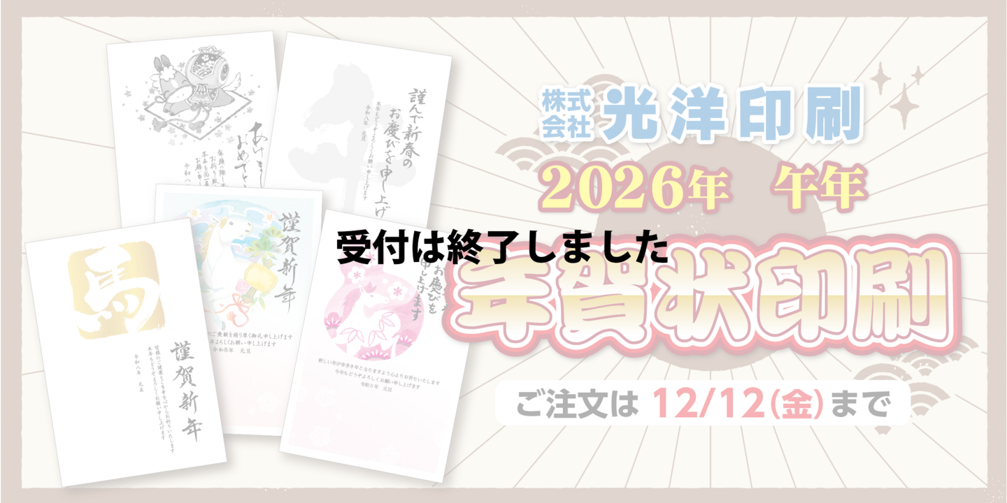 店頭でのお申込み◆直接お申し込みの場合は、東根工場の店頭までお越しください。◆上記のデザイン集からお好きなデザインをお選びいただき、当社で印刷致します。カット(イラスト)と文章の組み合わせを変更しての印刷も可能です。オリジナルデザインとの組み合わせでの印刷も承っております。◆お年玉付き官製はがき(年賀はがき)をお持ちの場合は、お客様のはがきに直接印刷させていただきます。絵柄つきはがきに印刷することも可能ですが、正しく印刷できない場合もありますのでご了承ください。
