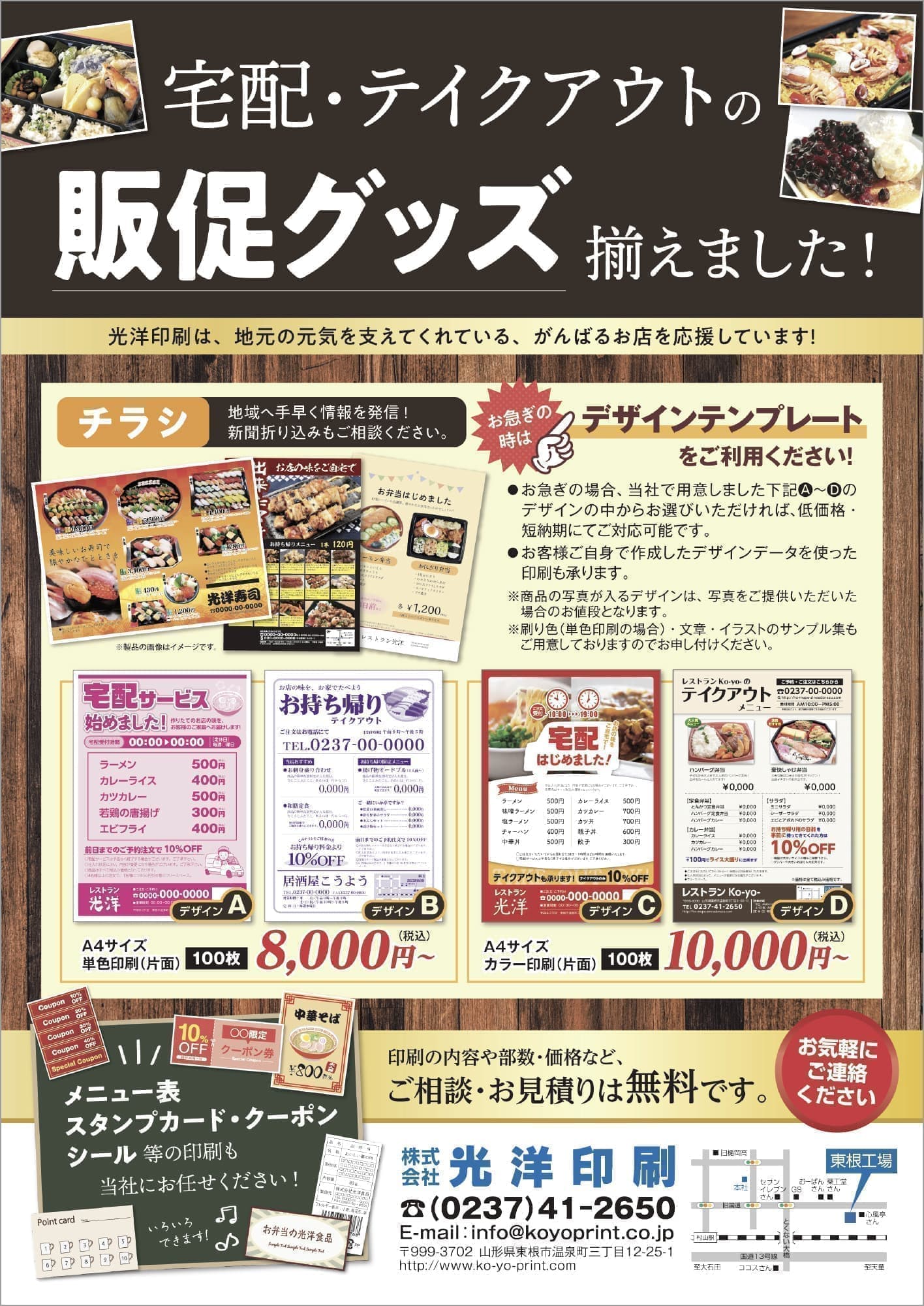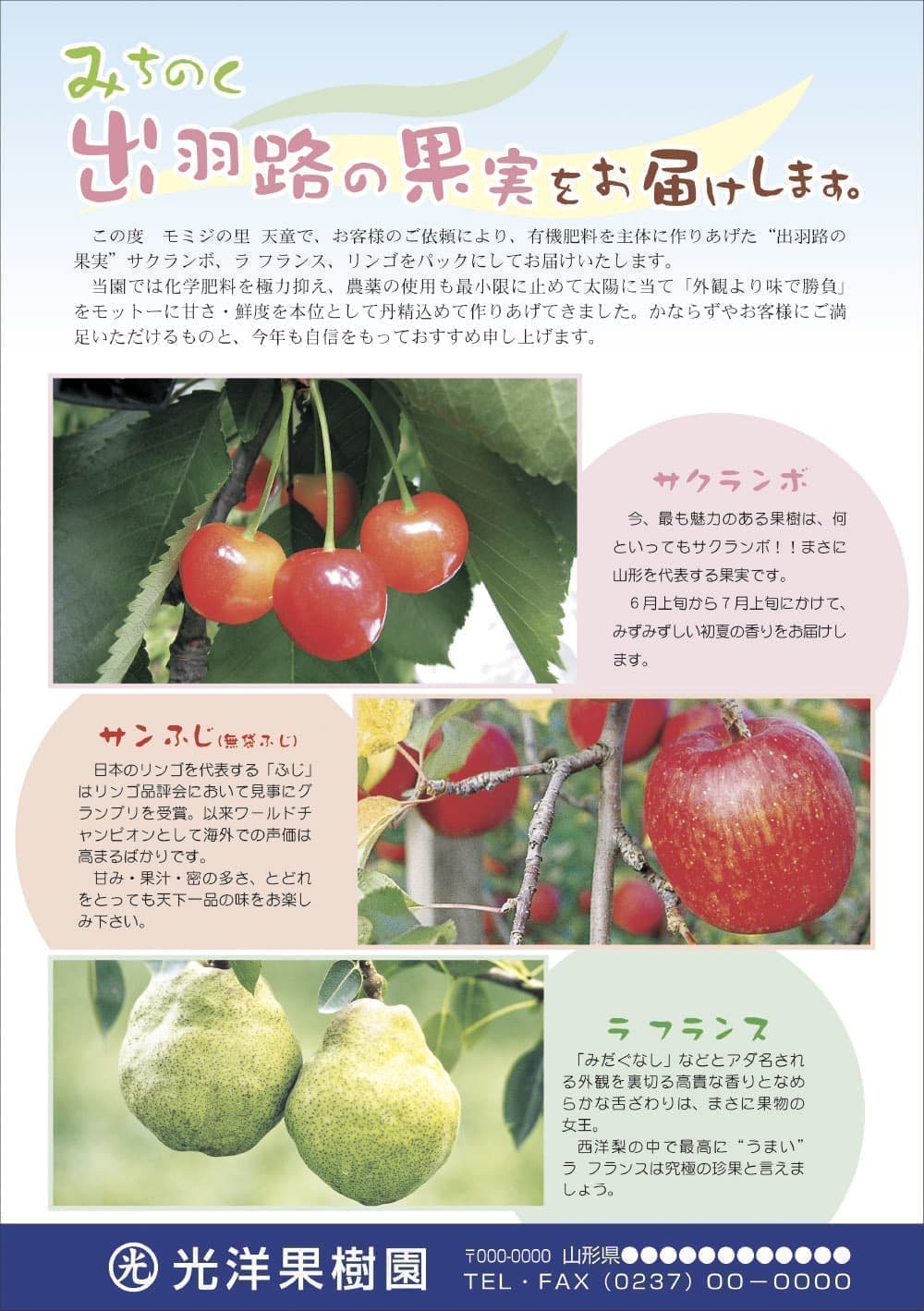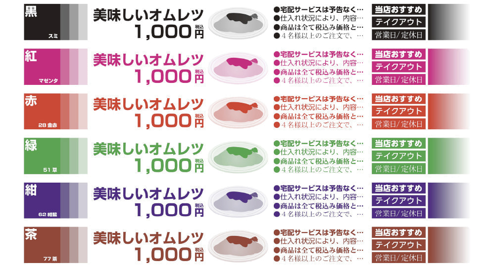 チラシサンプル 画像をクリックすると拡大して表示することができます。 販促・宅配・テイクアウトチラシ フリーイラストサンプル 単色用カラーサンプル ※印刷用の色なので、実際の色味とは異なります。 おすすめ書体見本 サンプル例文集 贈答用果樹リーフレット サンプル一覧へ 営業品目 年賀状デザイン サンプル集 チラシポスター パンフレットカタログ・冊子 名刺 はがき挨拶状 封筒 伝票 トップページへ 営業品目一覧 営業品目紹介 年賀状デザイン サンプル集